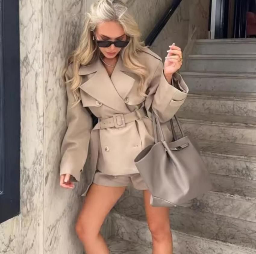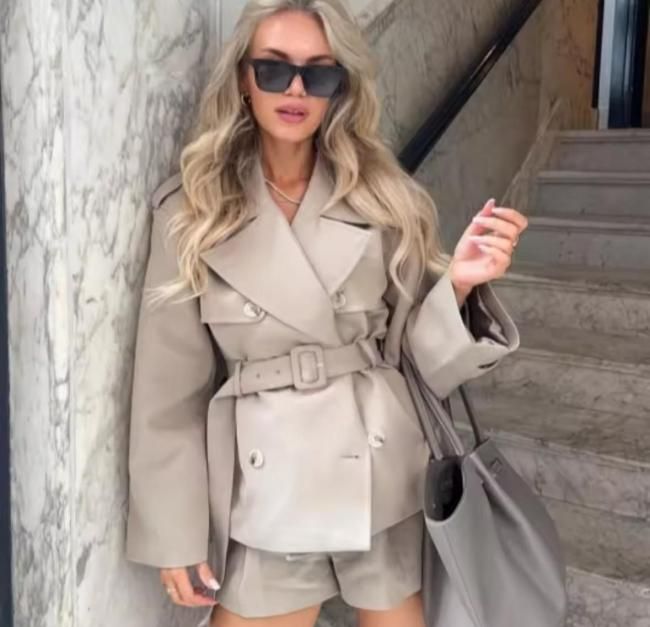 このセットアップは、ショート丈のトレンチコートとショートパンツが1セットになったお得なアイテムです。トレンチコートはショート丈なので、軽やかでスタイリッシュな印象を与えます。また、単品でも着用できるので、コーディネートの幅が広がります。